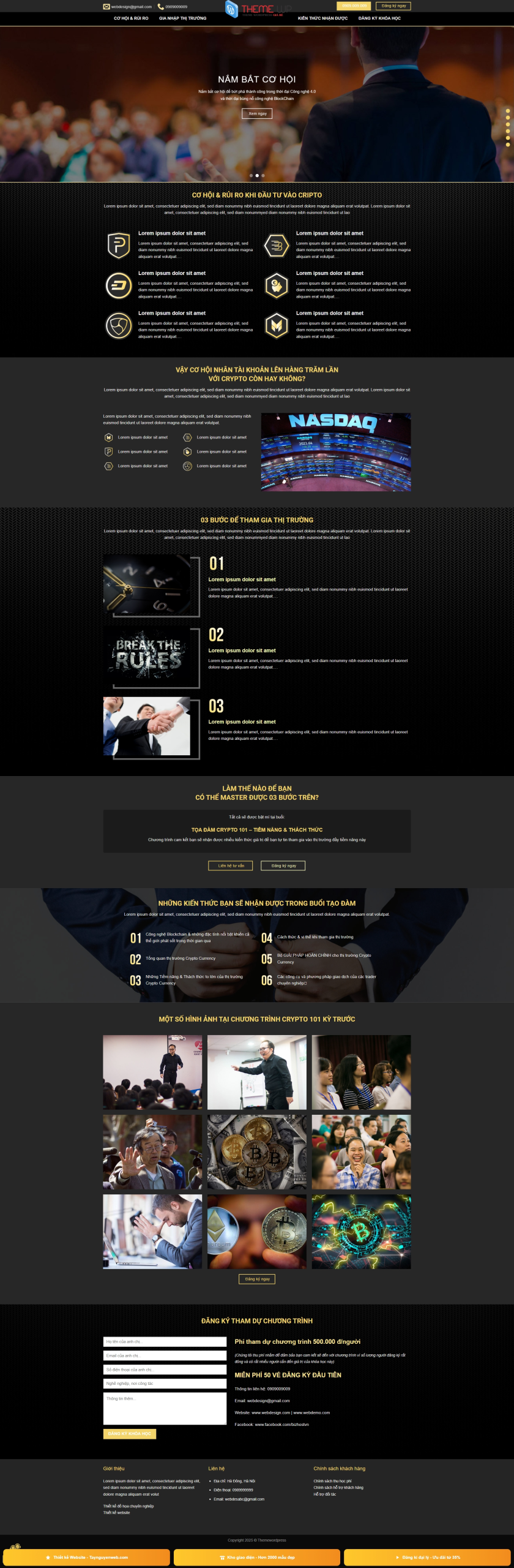 Footer (cuối trang): thông tin doanh nghiệp (địa chỉ, hotline, email), liên kết nhanh (chương trình, blog, chính sách), mạng xã hội, bản quyền.