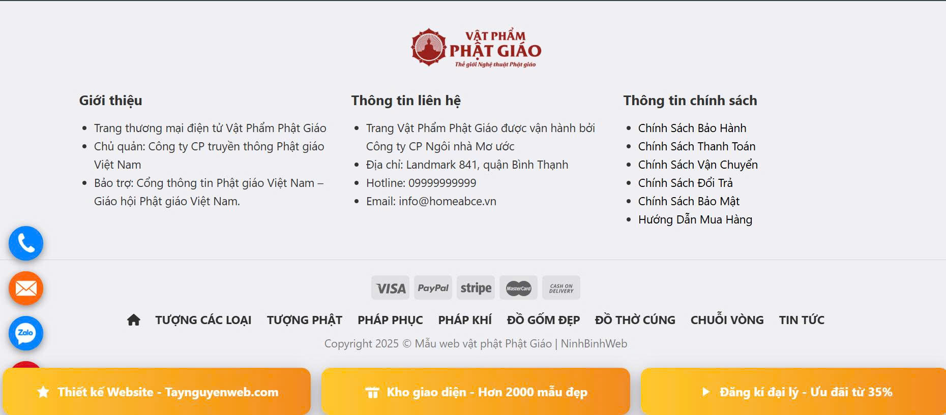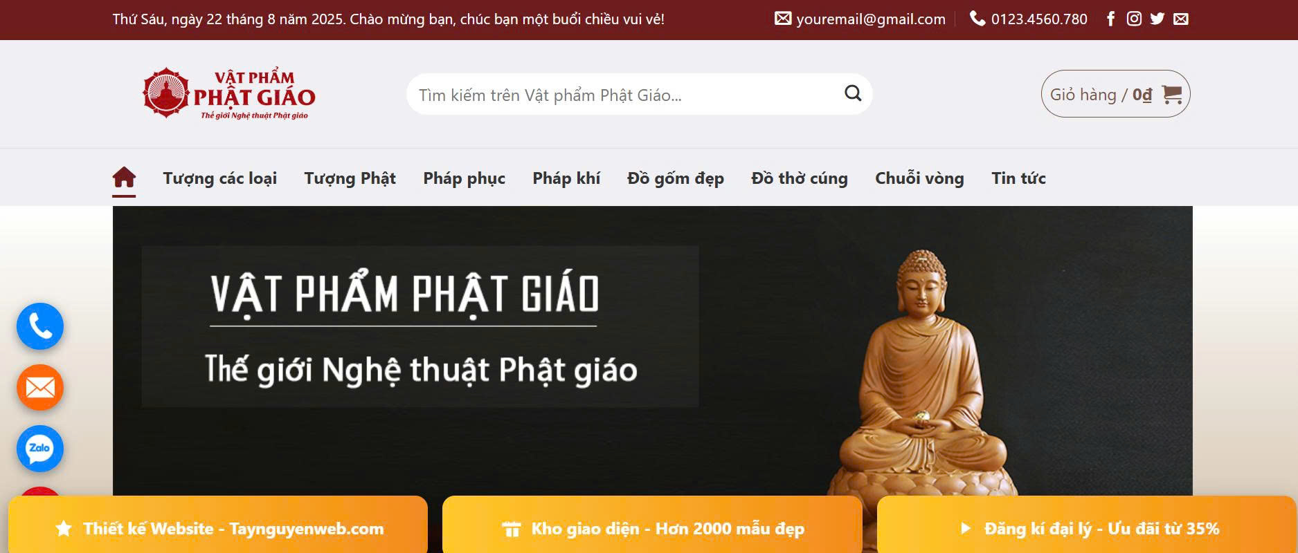 Mẫu giao diện website vật phẩm Phật Giáo được thiết kế hiện đại, thân thiện với người dùng, phù hợp cho các cửa hàng kinh doanh vật phẩm phong thủy, quà tặng, phụ kiện trang trí, đồ lưu niệm. Giao diện tối ưu trải nghiệm mua sắm trực tuyến, giúp sản phẩm nổi bật và tăng tỷ lệ chuyển đổi đơn hàng.